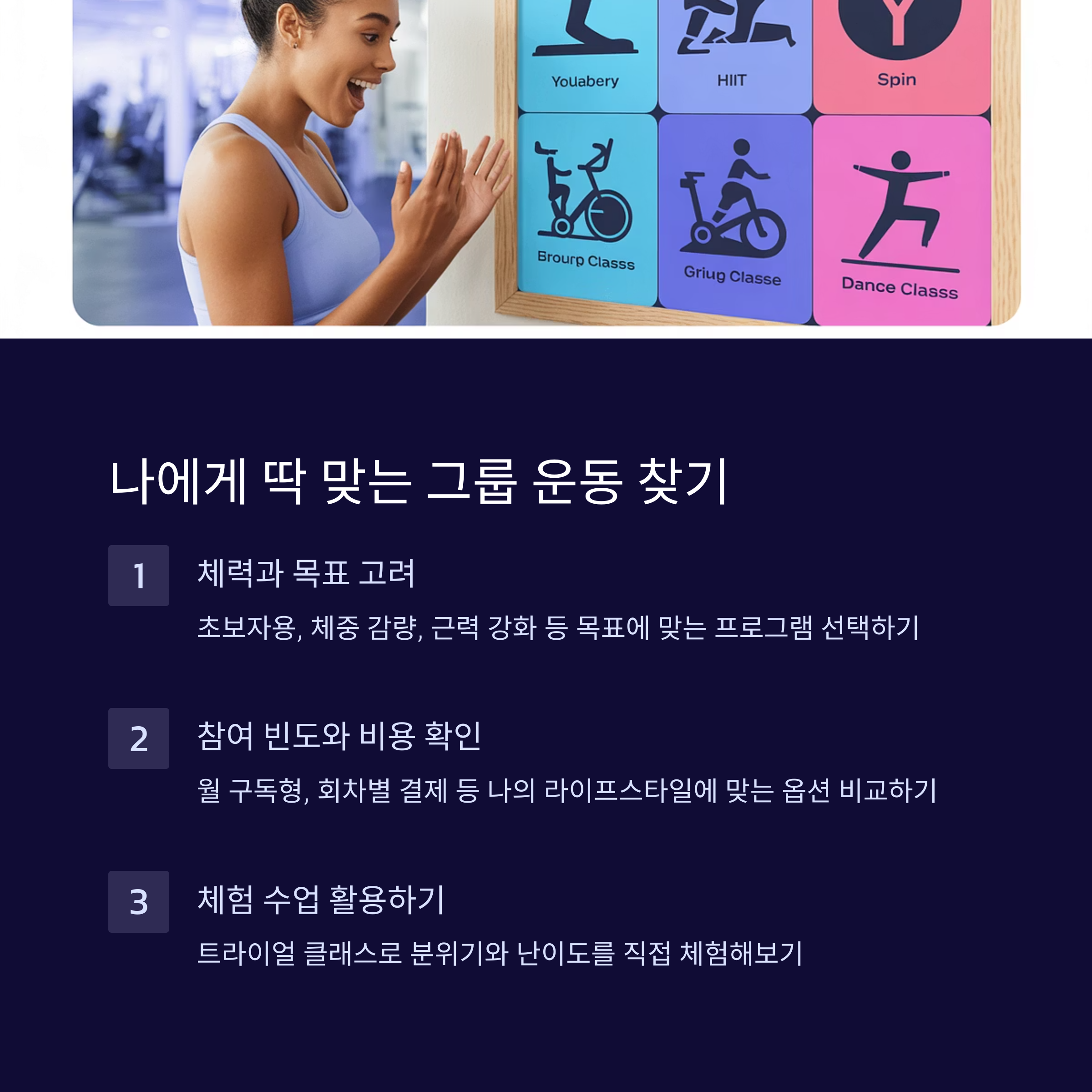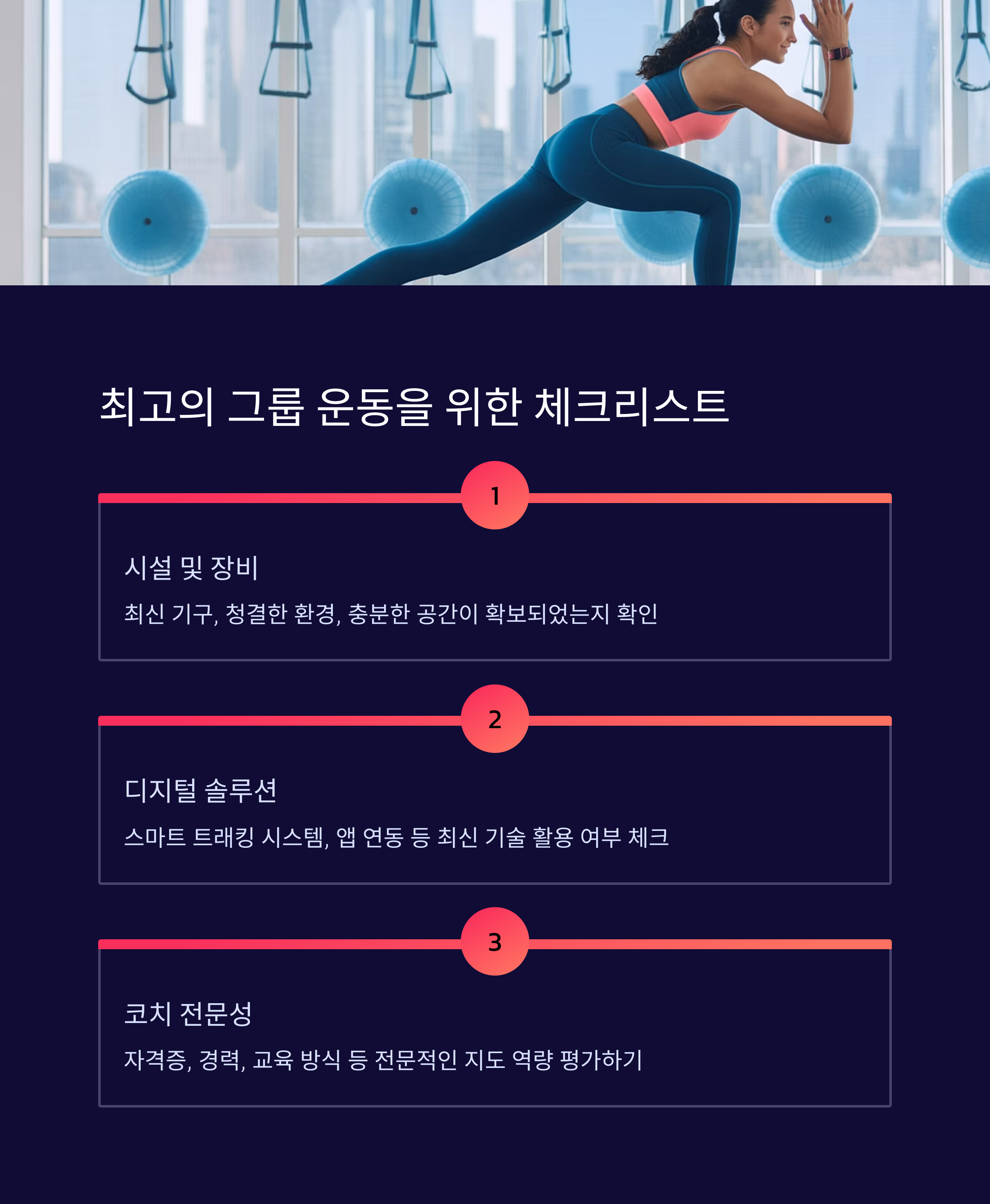 우리가 수립한 목표를 효과적으로 달성하기 위해서는 전략적이고 체계적인 접근이 필요합니다. 아래의 체크리스트는 피트니스 그룹에 성공적으로 참여하기 위해 고려해야 할 중요한 방법들을 제시합니다. 이러한 가이드는 개인의 필요와 목표를 명확히 하고 이를 바탕으로 적합한 그룹을 찾는 데 큰 역할을 합니다. 💪