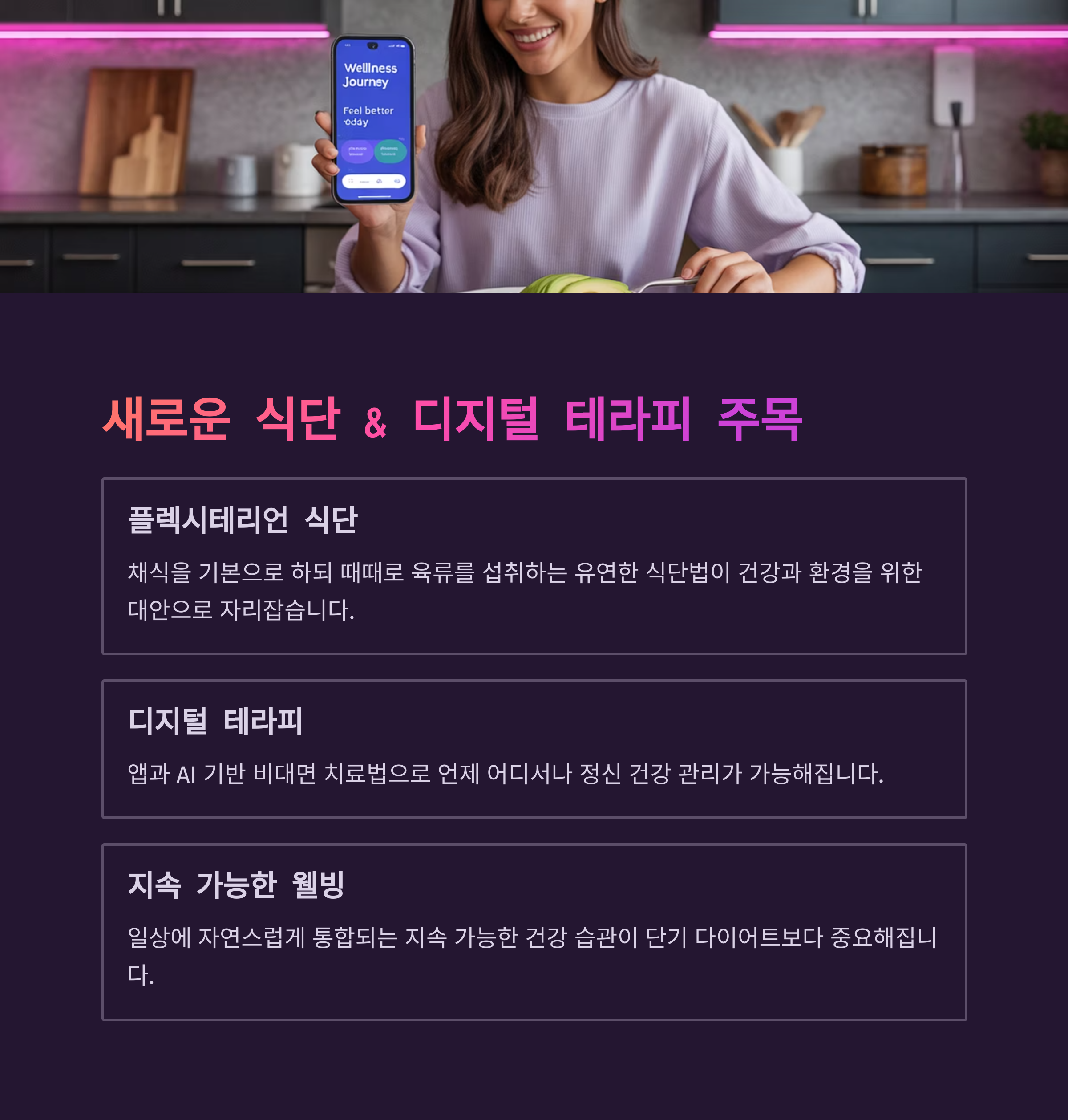 2025년에는 운동과 정신 건강 관리에 대한 접근이 상당히 변화하고 있습니다. 특히, 플렉시테리언 식단을 따르는 사람들이 점점 늘어나고 있는데, 이는 보다 유연한 식이 습관을 반영한 결과입니다. 이러한 변화는 건강과 웰빙을 동시에 추구하는 현대인의 라이프스타일을 잘 보여줍니다. 성인의 30% 이상이 플렉시테리언 식단을 실천하고 있으며, 이는 2020년 대비 두 배 이상 증가한 수치입니다. 또 다른 주목할 만한 변화는 디지털 테라피와 마음 챙김 루틴의 확산입니다. AI 기반의 심리 상담 및 명상 앱은 2025년까지 전 세계에서