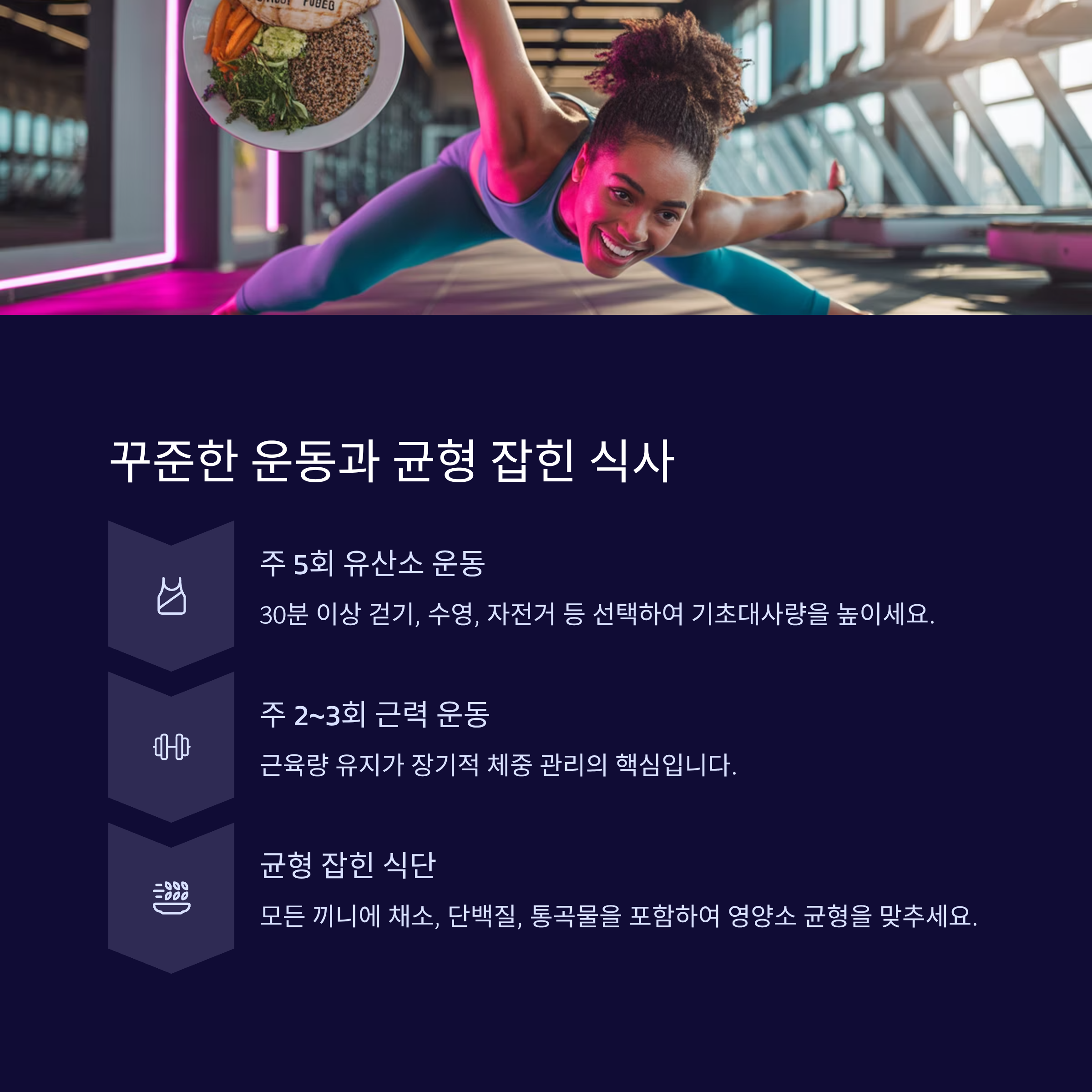 목표 시각화, 유산소 및 근력운동, 균형 잡힌 식단, 생활습관 변화 등을 통해 지속적인