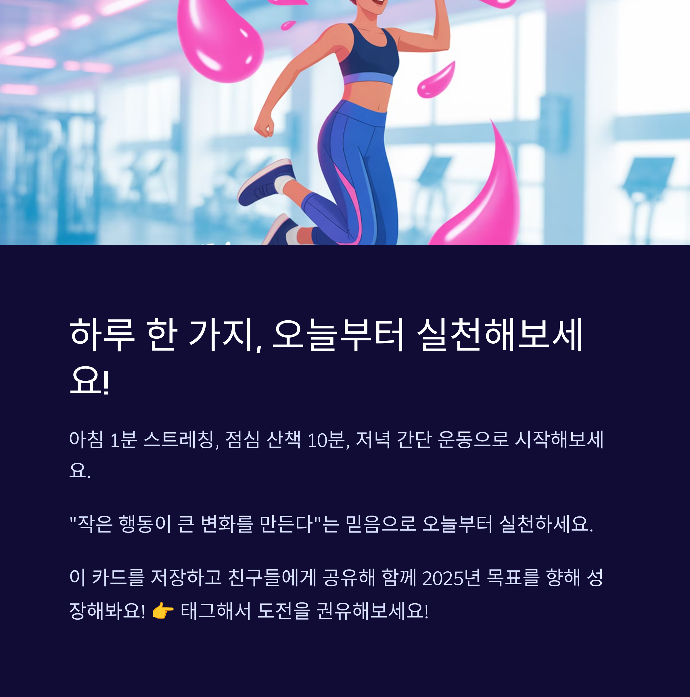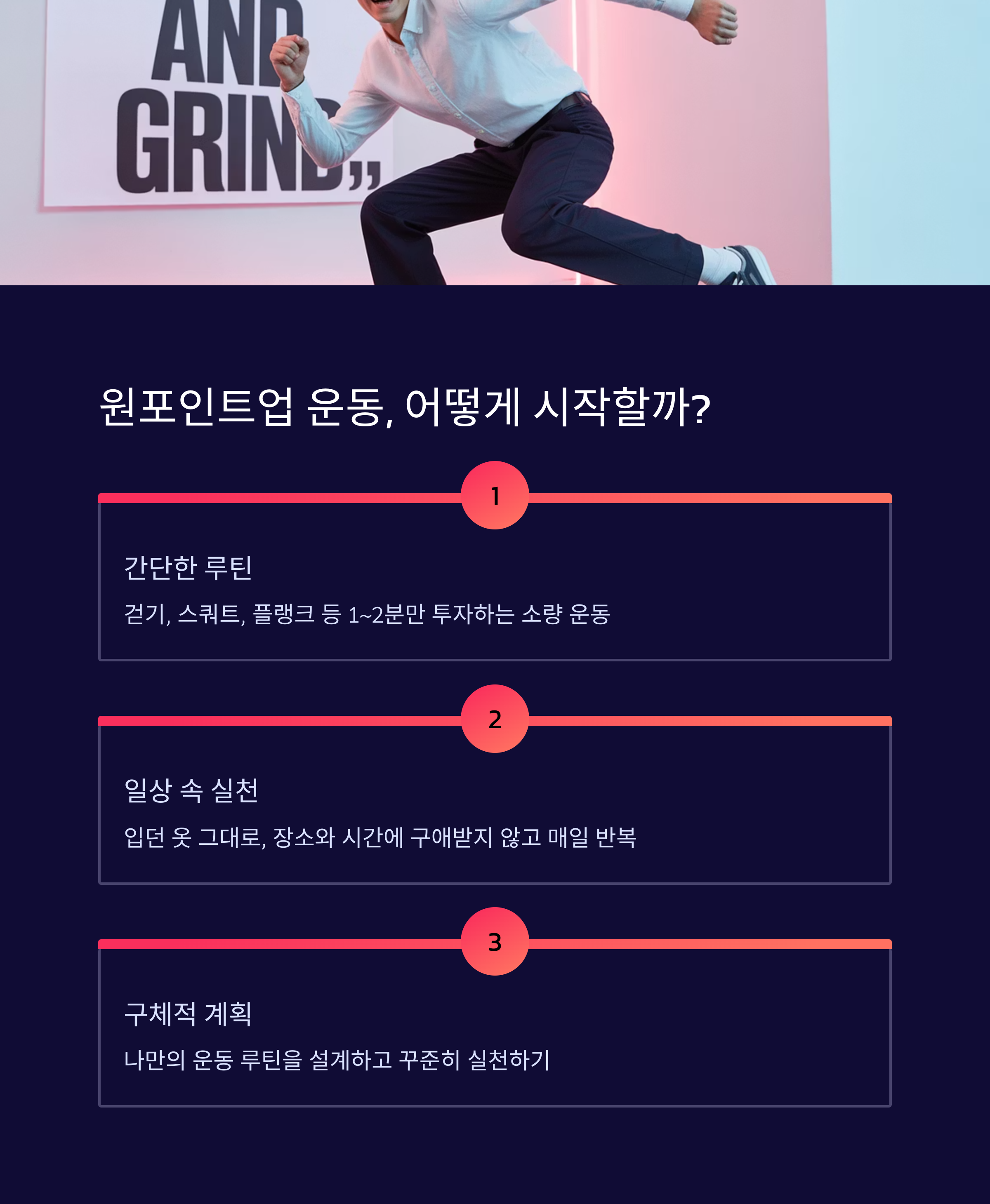 모든 변화는 작은 것에서 시작됩니다. ‘원포인트업’ 운동은 단기간의 큰 변화를 바라는 우리의 욕구를 충족시키기보다 꾸준한 실천을 통해 장기적인 효과를 얻을 수 있게 도움을 줍니다. 이러한 점에서 체력 향상뿐만 아니라 심리적으로도 긍정적인 효과를 경험하게 될 것입니다. 이제 여러분의 새로운 습관으로 이 운동을 시도해보시고, 스스로의 변화를 체감해 보세요. 우리가 공유한 정보가 여러분의 새로운 시작에 유용한 도구가 되기를 바랍니다.
