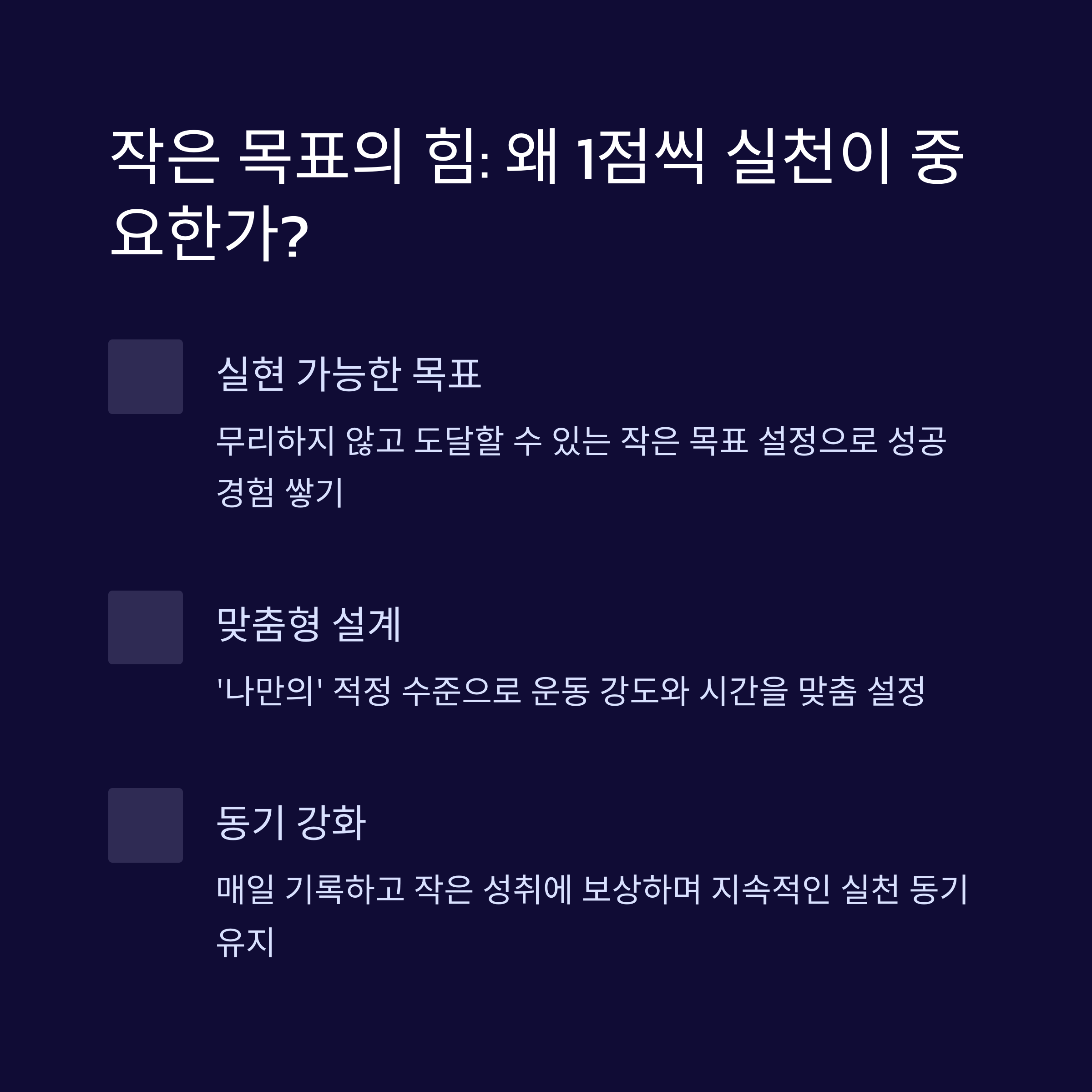‘원포인트업’ 운동을 일상에 적용하는 것은 어렵지 않습니다. 이 운동의 핵심은 작고 구체적인 목표 설정, 무리하지 않는 강도의 실천, 운동 기록과 자기 점검 및 피드백의 반복에 있습니다. 특히 이 운동 방법은 작은 목표를 달성할 때 마다 적절한 보상을 제공하며, 새로운 목표를 즉시 설정하는 데에도 그 의의가 있습니다. 🤔 이 과정을 통해 목표를 달성하는 기쁨뿐만 아니라 지속 가능한 건강 습관을 만들어 나갈 수 있습니다.
