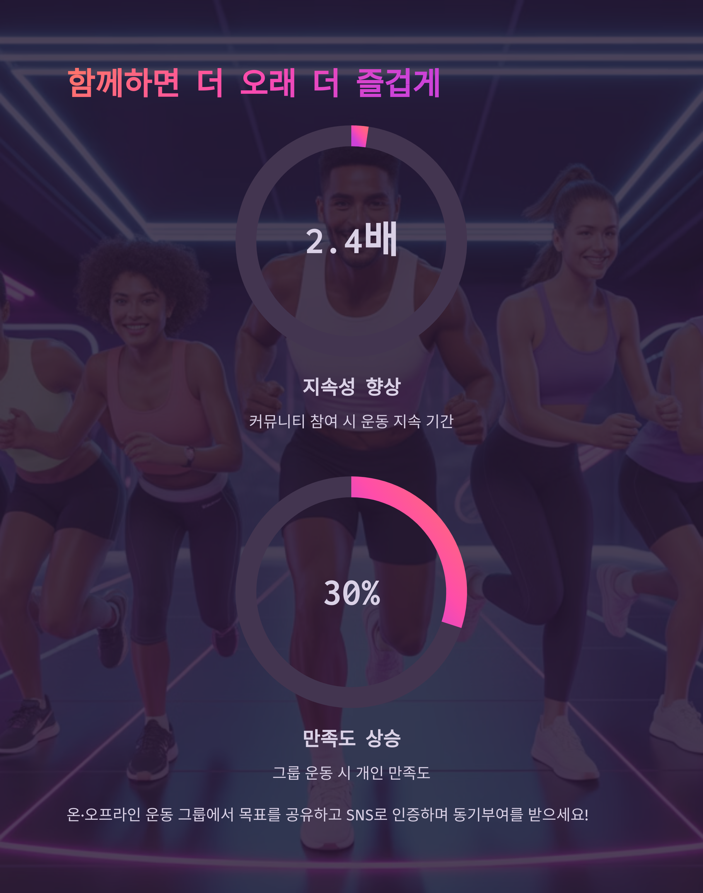| 지루함 감소 | 다양한 운동 접목 | 커뮤니티 참가자 지속률 2.4배 증가 |